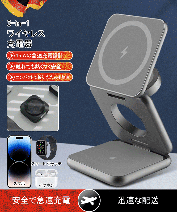1台3役·折り畳み式 スタンドタイプのワイヤレス充電器
