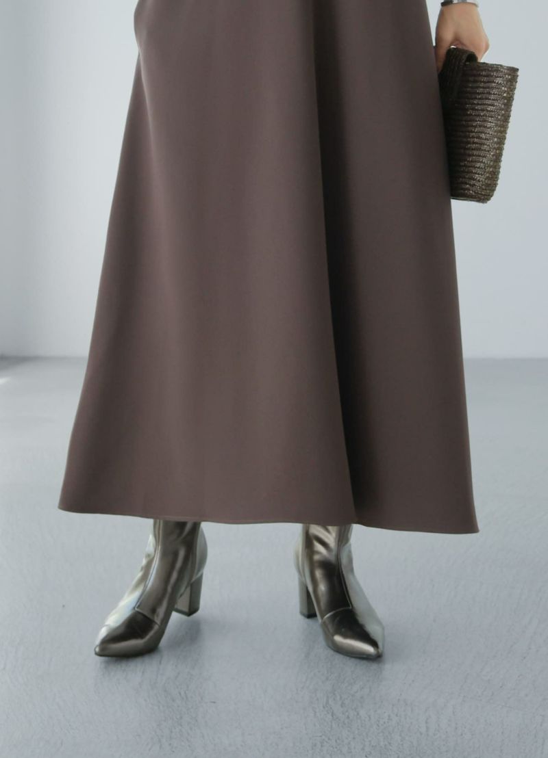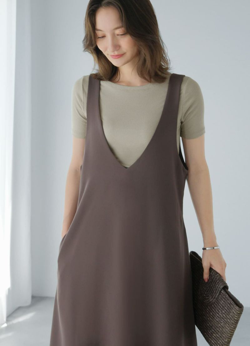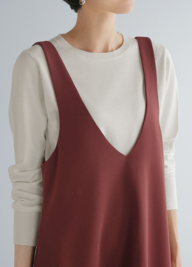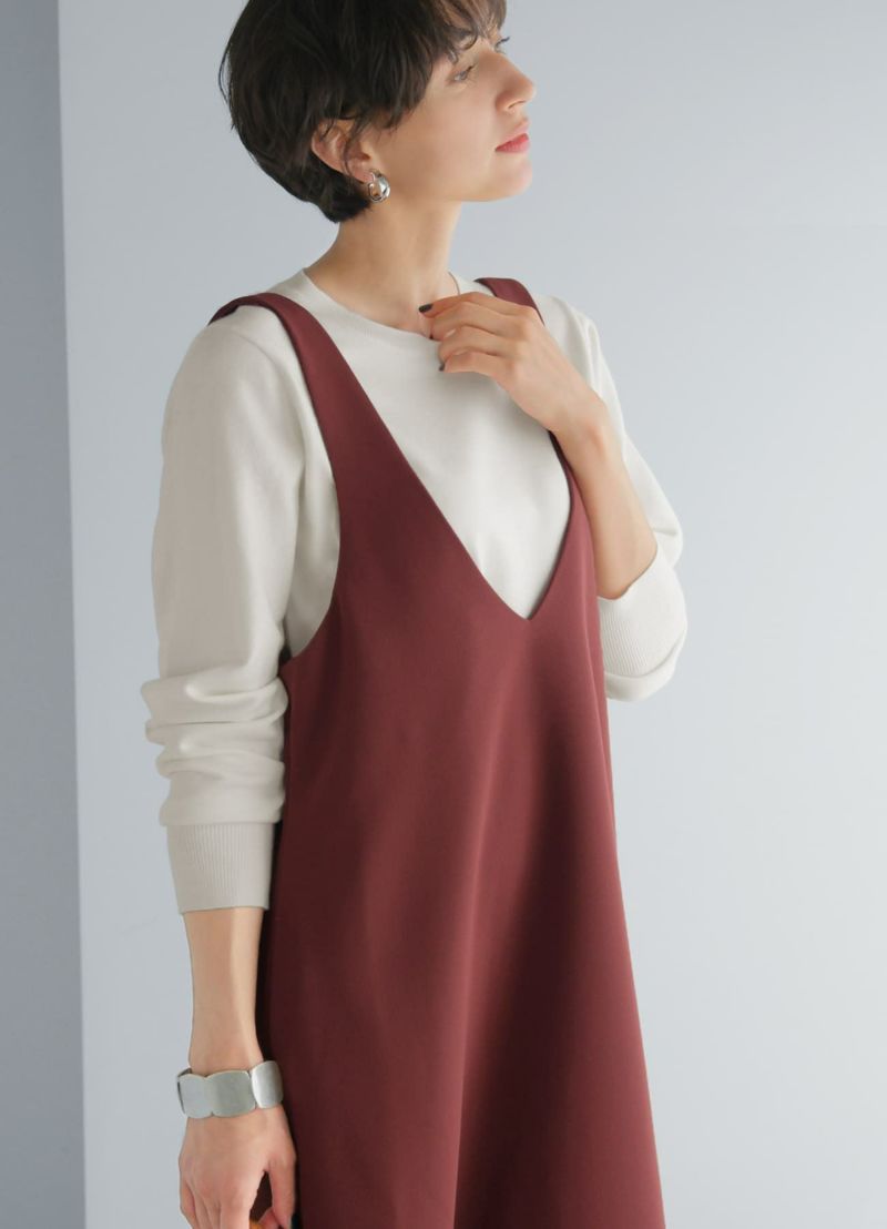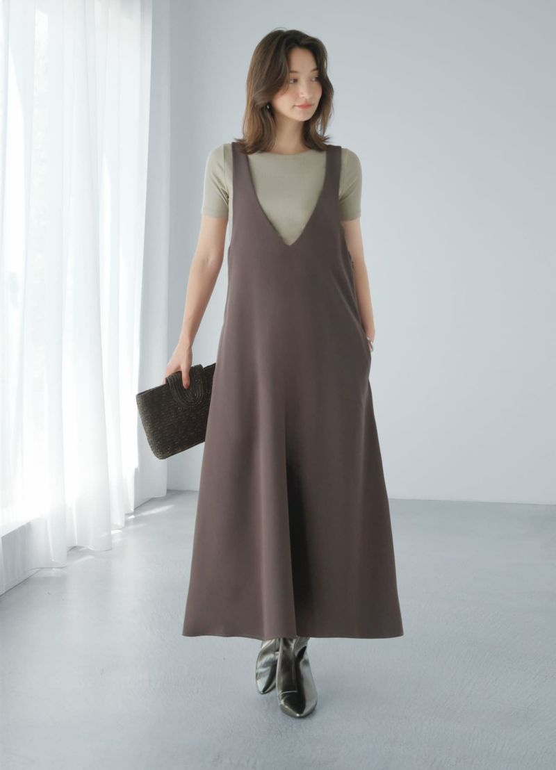 こういったV字フロント系ジャンパースカートは割とストンと落ちるシルエットのものが多いなか、少しだけフレア(あるいはAライン)な形というのも新鮮。Iラインだとヒップ周りが心配な方にもお薦めです。